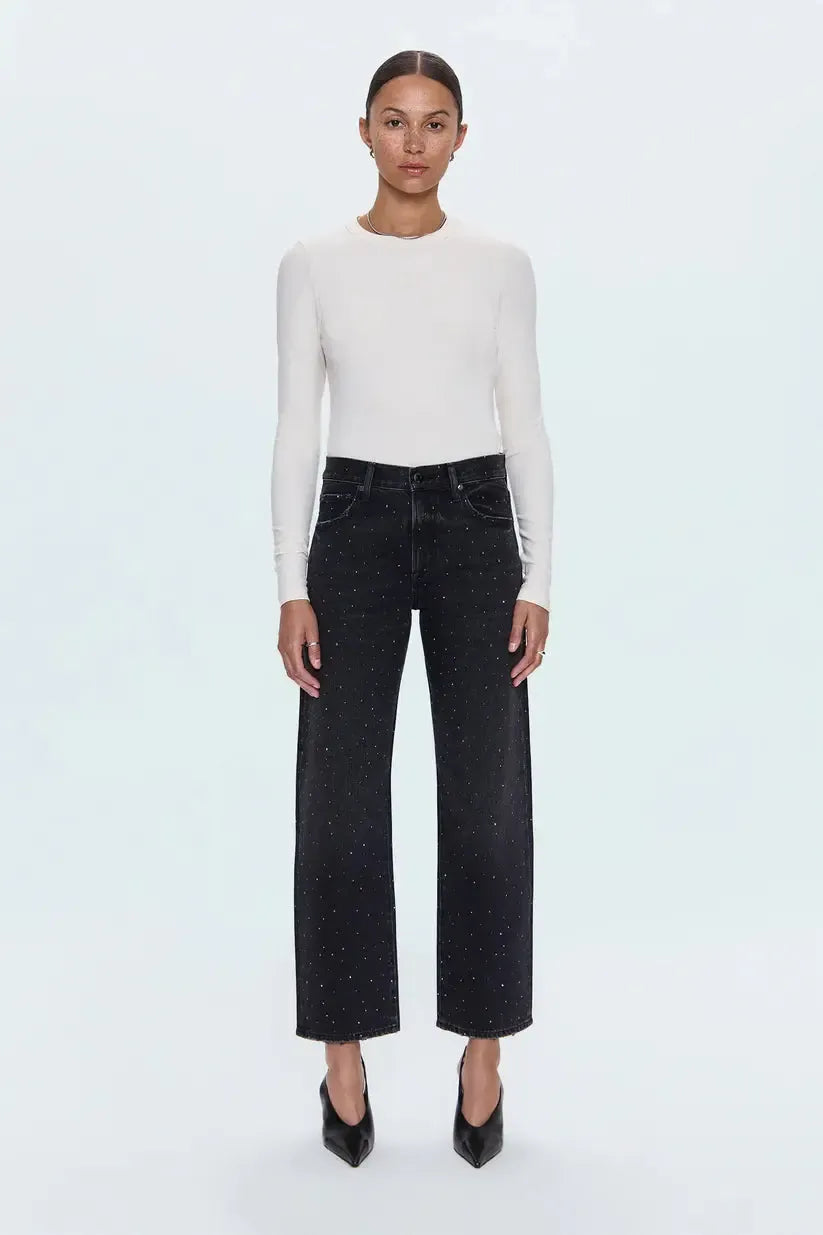 A best-selling silhouette, Lexi features a mid-rise and signature bowed straight leg with a subtle curve through the knee for dimension and ease. The 29" inseam tapers to a clean, cropped ankle. Crafted from rigid denim in Silver Screen, a black wash adorned with micro rhinestones that catch the light for understated shimmer.