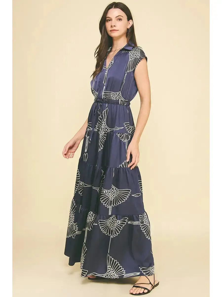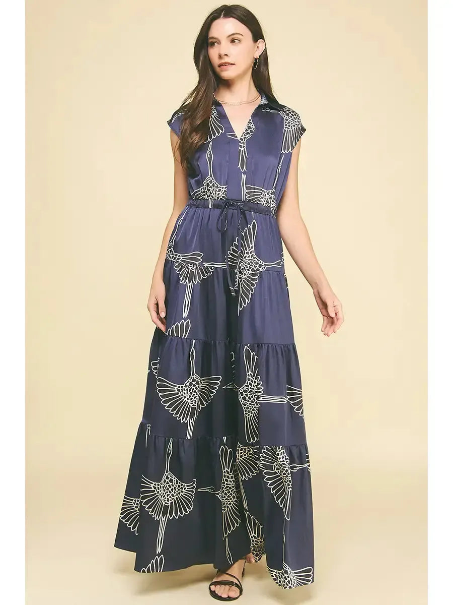 Elevate your wardrobe with this stunning tiered maxi dress, featuring an eye-catching crane print that commands attention. The flattering V-neckline and cap sleeves create a refined silhouette, while the tiered layers add movement and dimension. A self-tie waist cinches your figure for a custom fit that flatters every body type. Perfect for making a sophisticated statement at any occasion. (Model pictured wears size small.)
