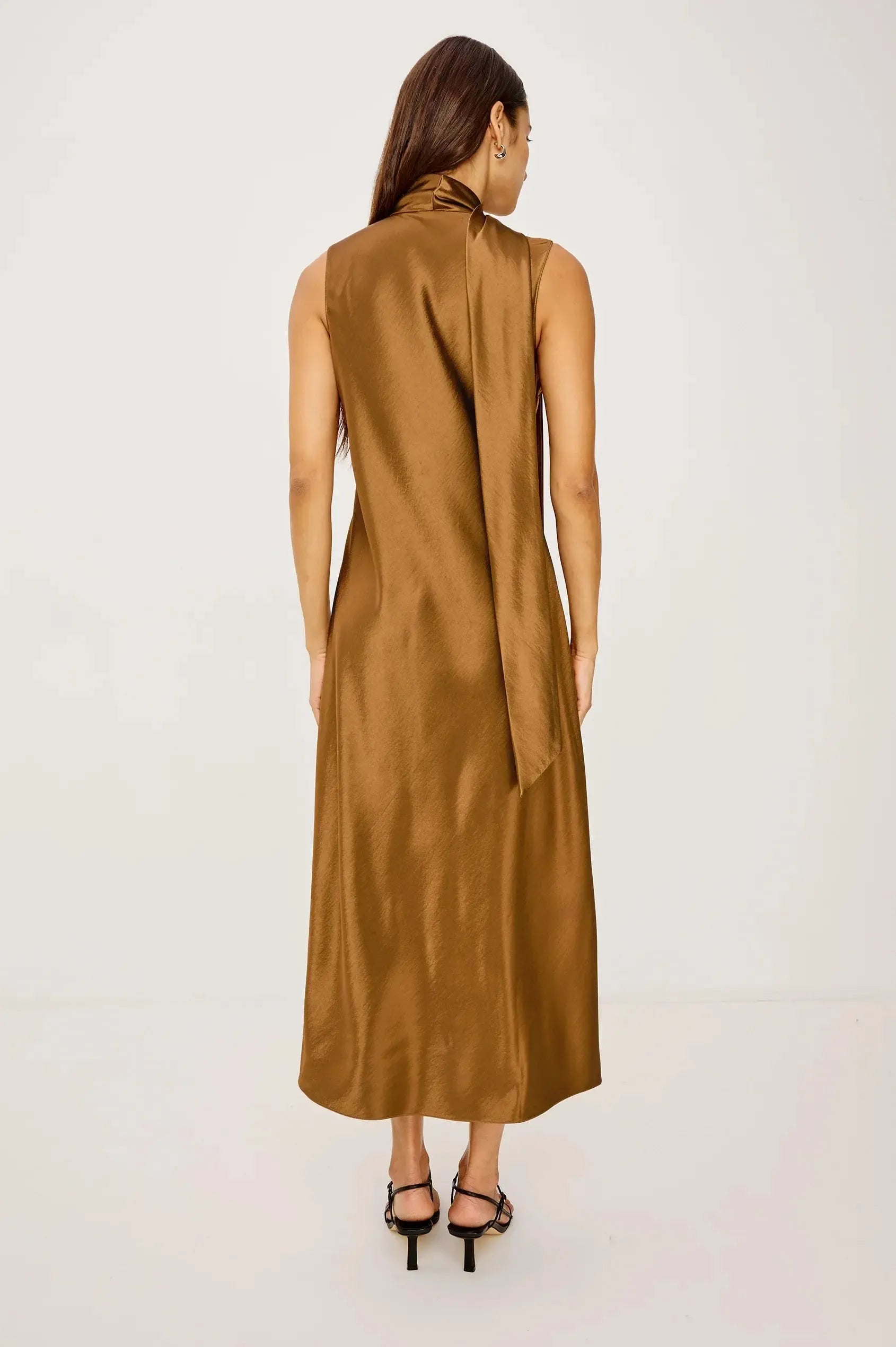Effortlessly eye-catching, the Lorenza is a midi-length dress in luxuriously silky fabric with a lustrous sheen, featuring a V-neckline, attached self-tie scarf, and sweeping bias-cut A-line skirt.