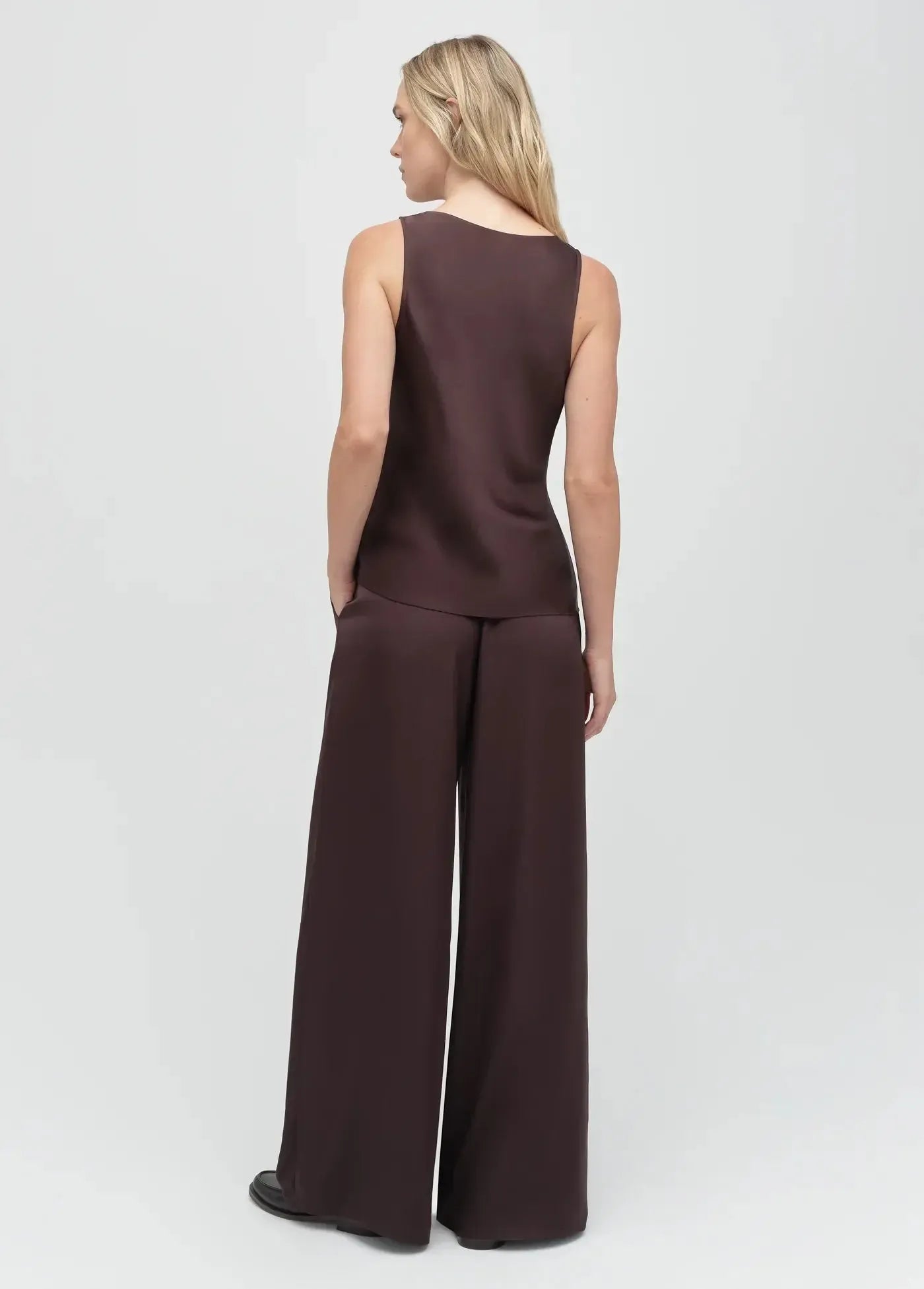 The Clean Cut Tank is all about clean lines and effortless style. Silky satin with a deep U-neck that looks just as good under a blazer as it does on its own.