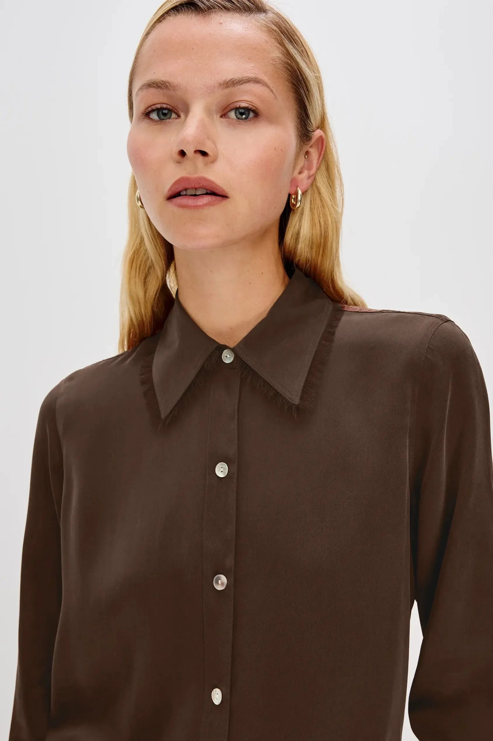 The Abbey jacket features a silk charmeuse fabric with raw edge accents on the collar and cuffs, combining effortless style with subtle feminine elegance. Designed for a relaxed fit, it is made from 100% silk and imported. For the best fit, we suggest selecting your usual size. The front body length measures 27" in size S. Dry cleaning is recommended to maintain its quality.