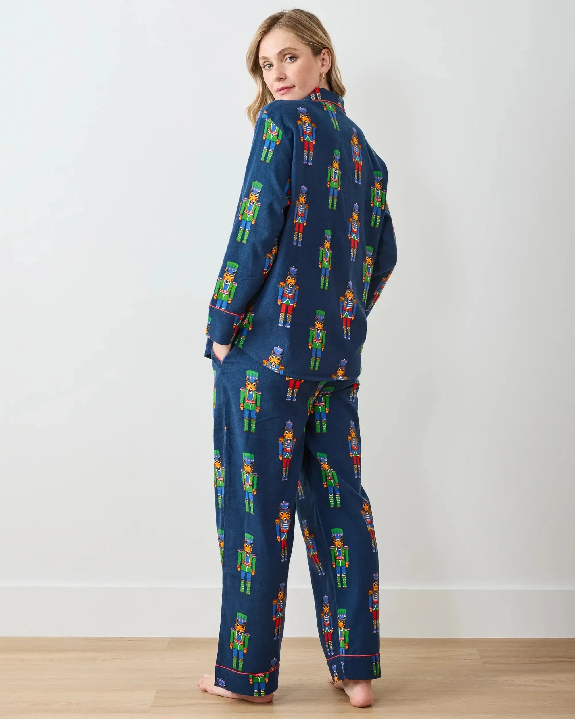 Celebrate the season in style with our Print Fresh Leopard Nutcracker Set in navy. Featuring a striking blend of elegant leopard prints and whimsical nutcracker designs, this organic flannel pajama collection brings festive charm to your nighttime routine. The relaxed button-down top drapes comfortably, while the full-length pants include functional pockets and an adjustable waistband for personalized fit. Ideal for holiday gatherings, lazy mornings, and those crisp winter evenings when you crave ultimate coziness.