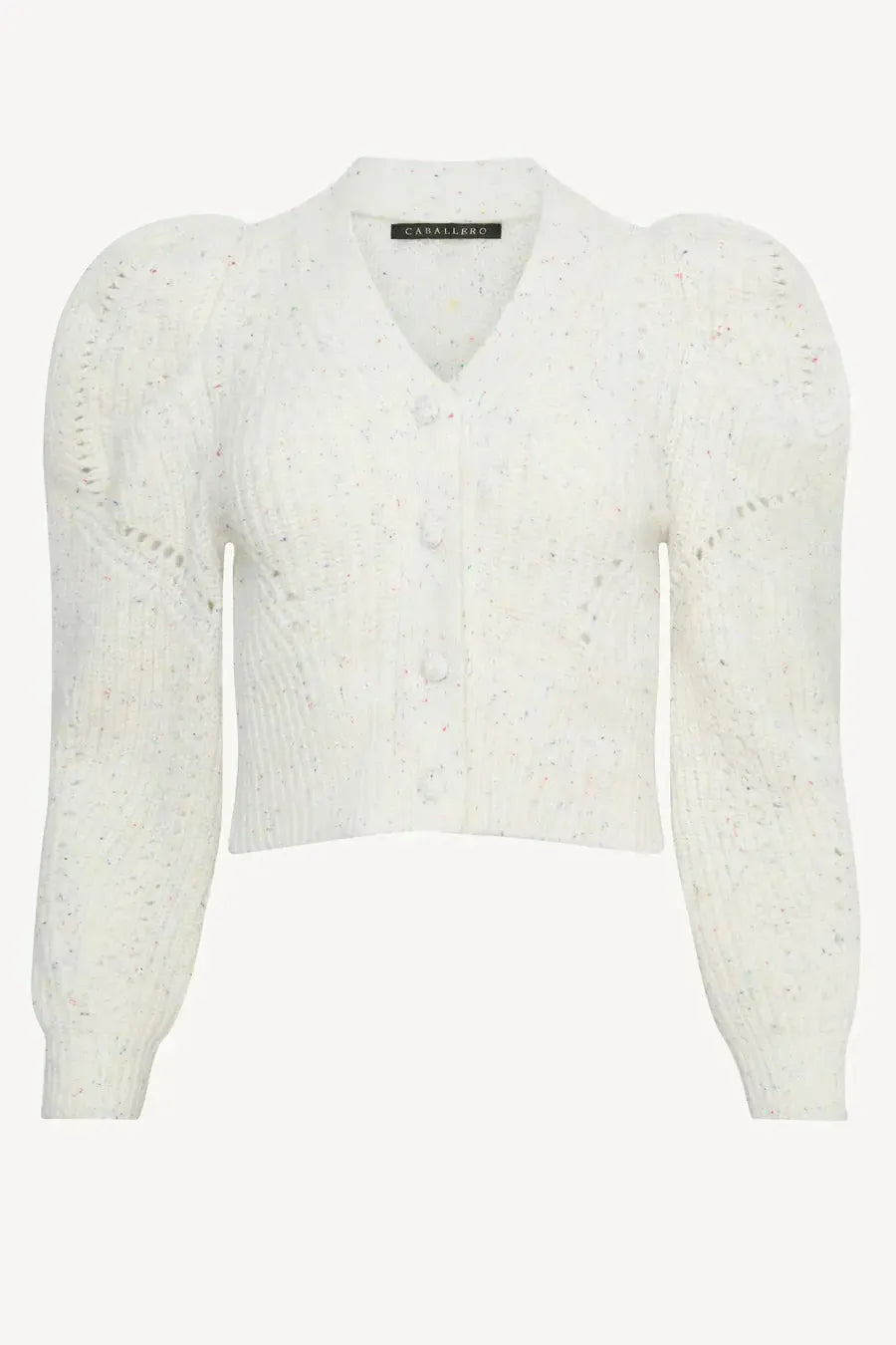 The Audra Sweater in Antique white is a charming cream-colored cropped cardigan made from a speckled knit fabric, featuring subtle colorful confetti throughout. It has a flattering V-neckline and button closures down the front, combining classic style with playful details.